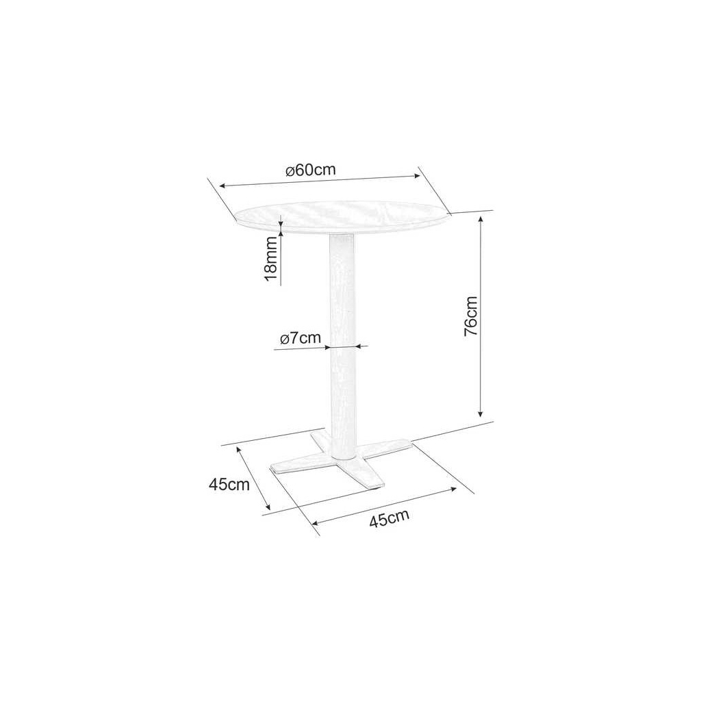 Deska ve tvaru kruhu s průměrem 60 cm je vyrobená z lakovaného MDF (dřevovláknité desky). Nohu a základnu pak tvoří lakovaná ocel. Podstava ve tvaru "X" zajišťuje potřebnou stabilitu.