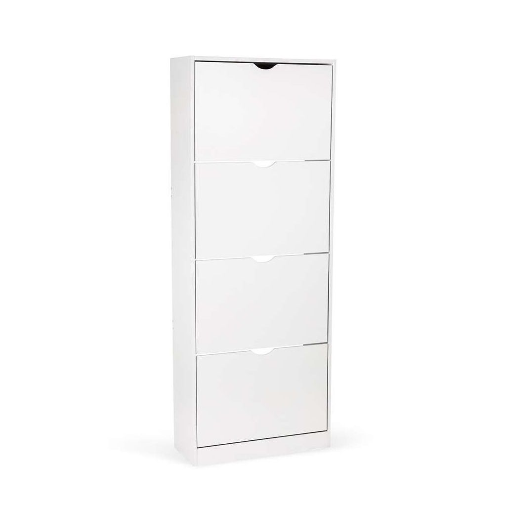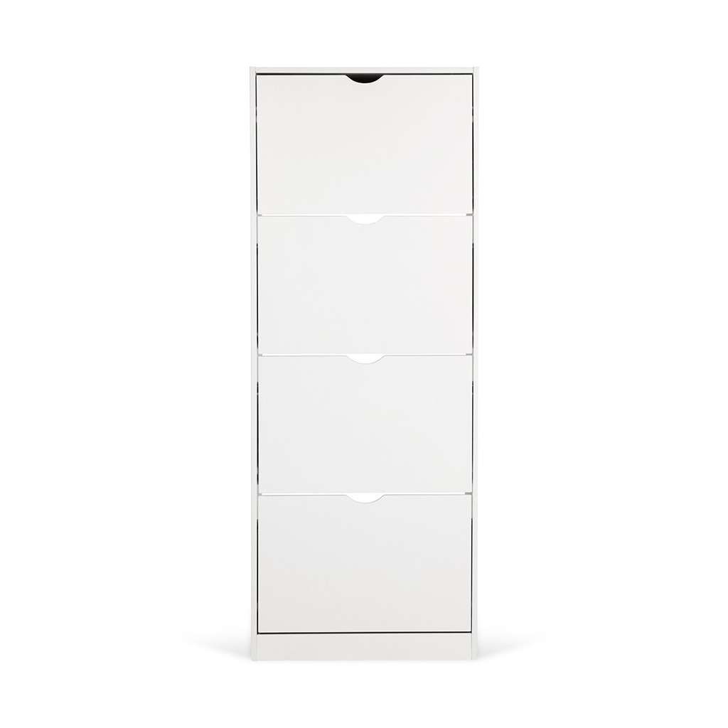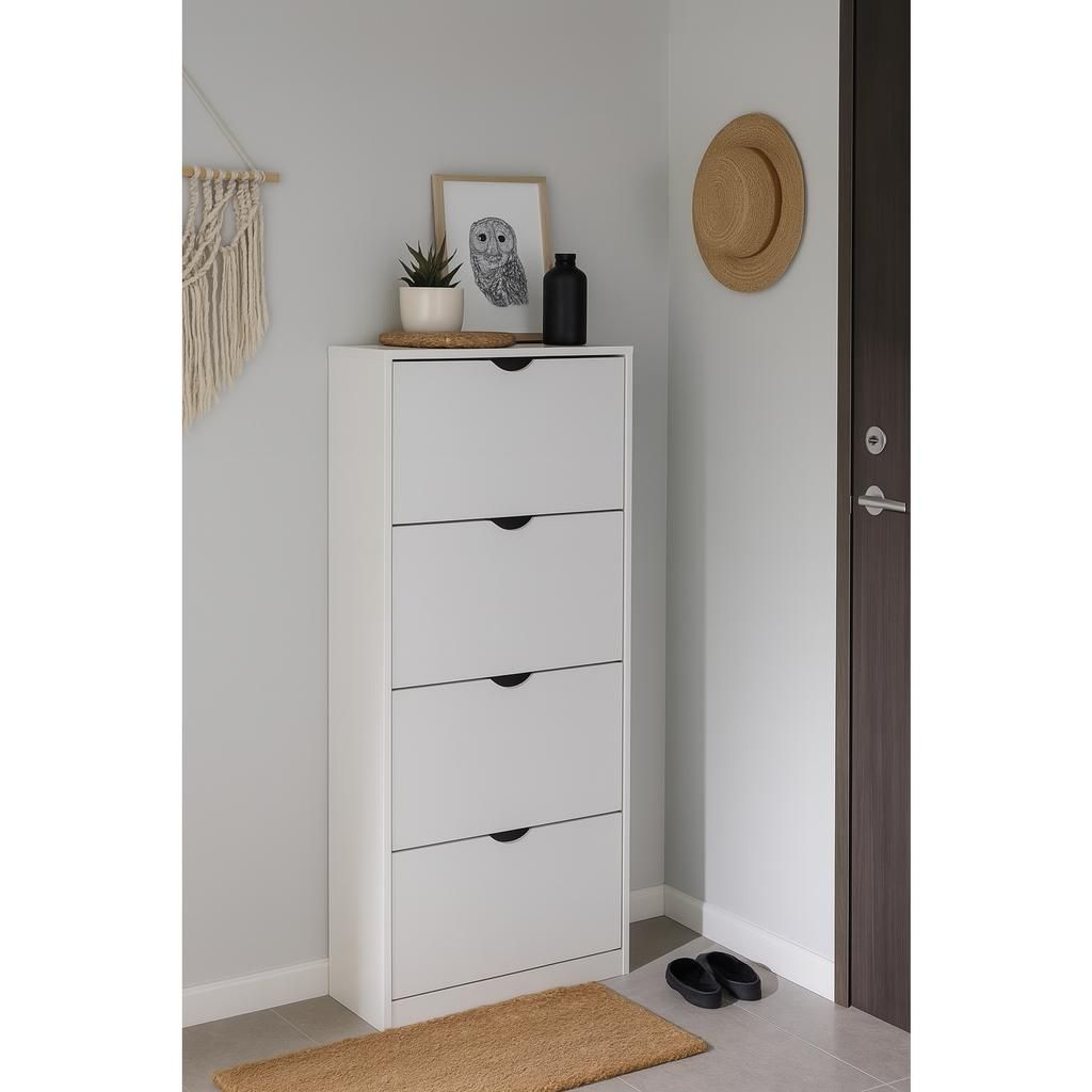 Botník Escondido - 4 oddíly je ideálním řešením pro uspořádání obuvi i v menších prostorách, díky svému úzkému a kompaktnímu tvaru. Využívá čtyři praktické výklopné přihrádky, které umožňují snadný přístup bez potřeby tradičních úchytek, místo kterých slouží výřezy pro otevření.