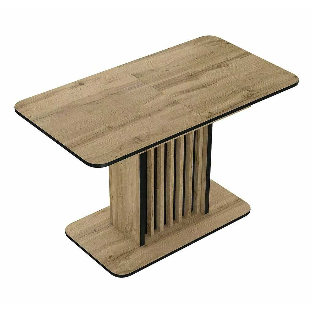 Všechny desky jsou z laminované dřevotřísky ve vkusné barevné kombinaci. Před rozložením má horní deska délku 130 cm a hloubku 85 cm – ideální pro 4 až 5 osob.