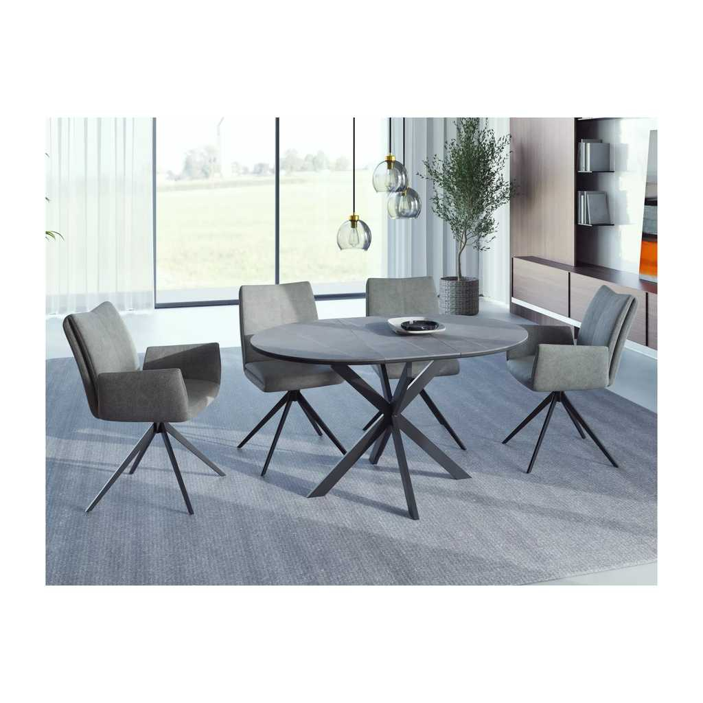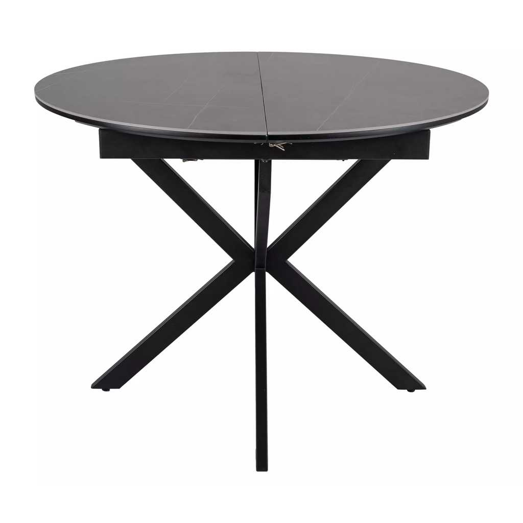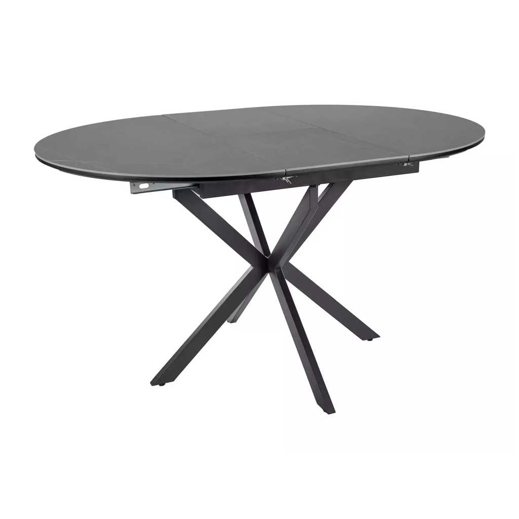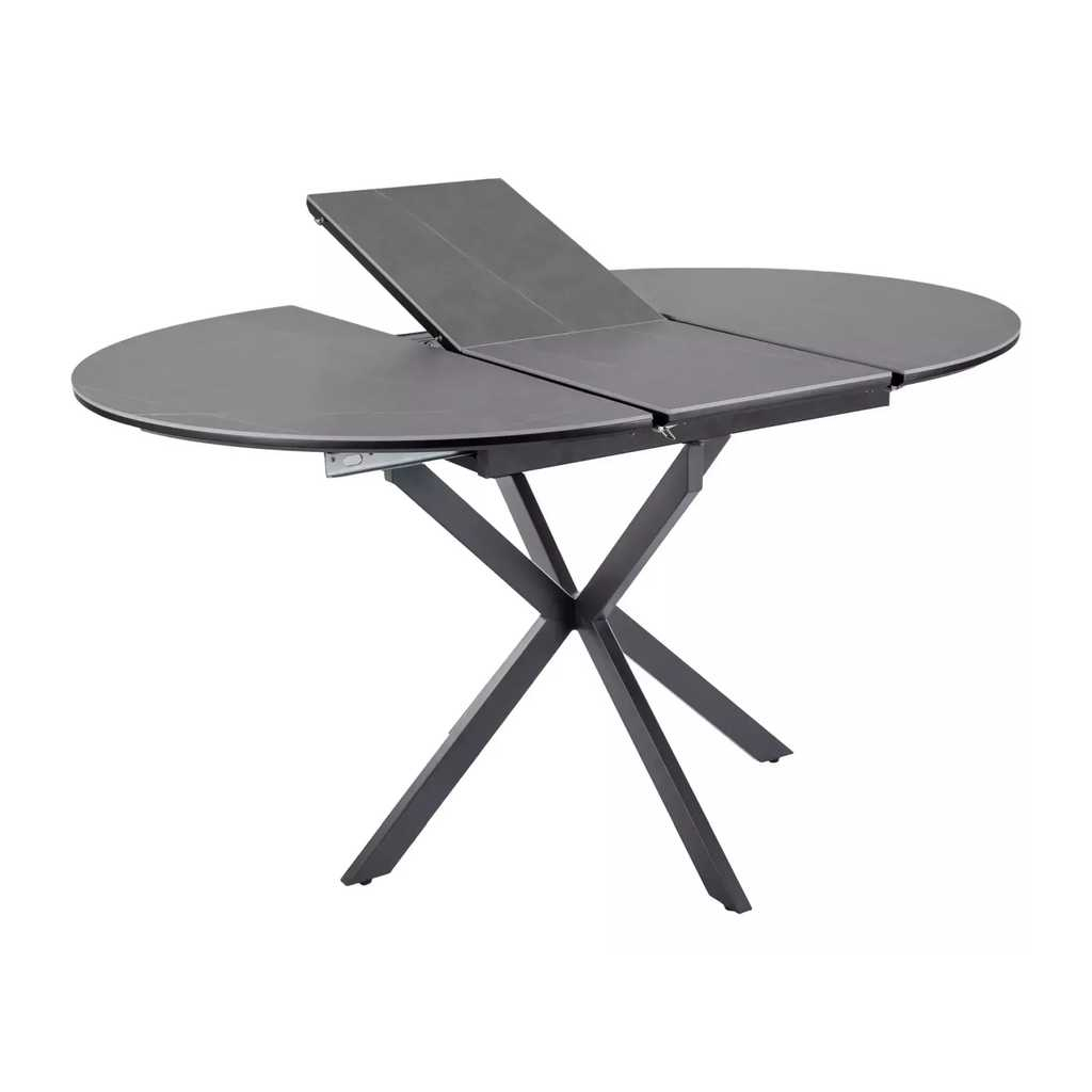 Horní deska stolu je vyrobena z keramického materiálu, který je odolný vůči poškrábání, vysokým teplotám a snadno se čistí. Stabilní kovová podnož zajišťuje pevnost a dlouhou životnost nábytku. Stůl má originální tvar horní desky v kombinaci kruhu a oválu, což přispívá k jeho netradičnímu a elegantnímu vzhledu.