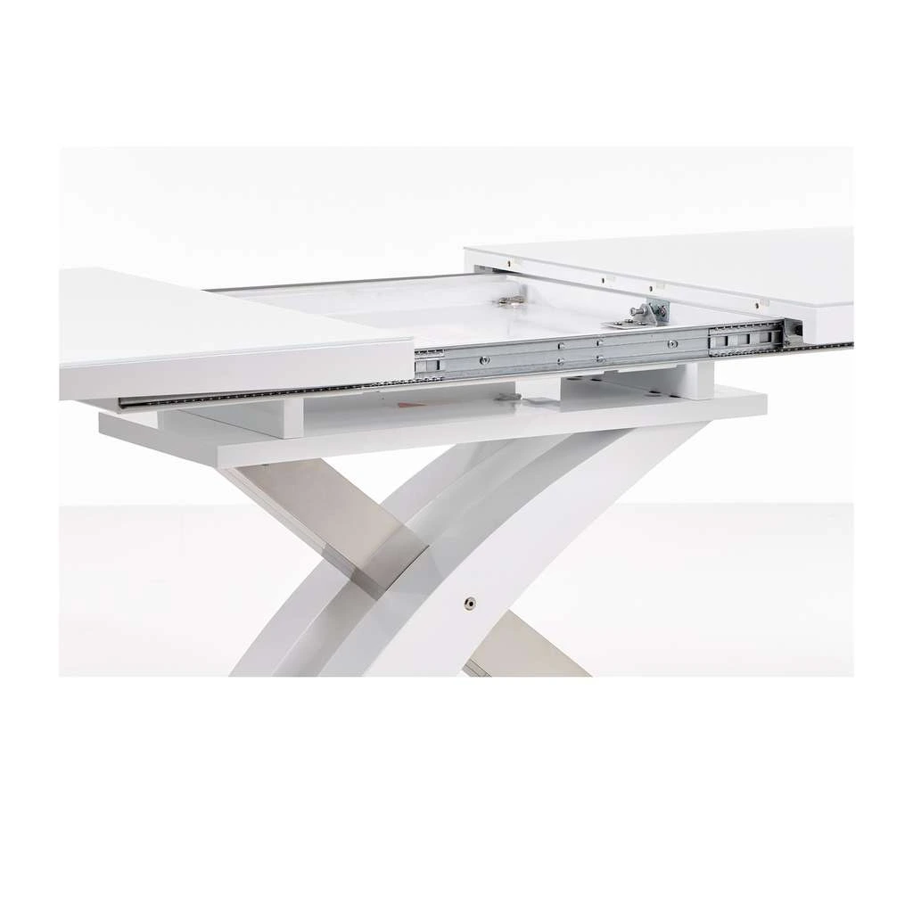 Deska stolu je z tvrzeného skla, přídavná deska pak z MDF. Dřevovláknitá je také podnož, a to v kombinaci s elegantním kovem.