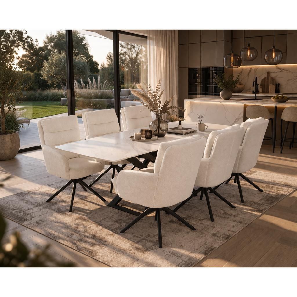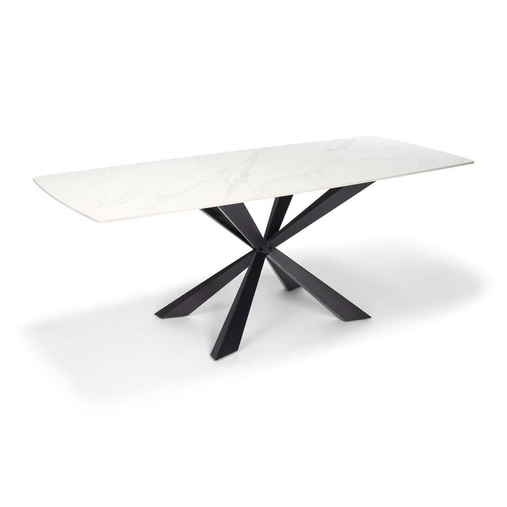 Kovová podnož je navržena s důrazem na stabilitu i styl. Originální křížení nohou dodává stolu zajímavý a moderní vzhled, který se hodí do různých interiérů – od prostorných jídelních zón po stylové apartmány. Díky svému jednoduchému obdélníkovému tvaru je stůl praktický a snadno se kombinuje s ostatním nábytkem.