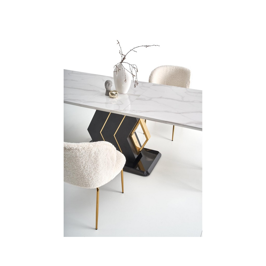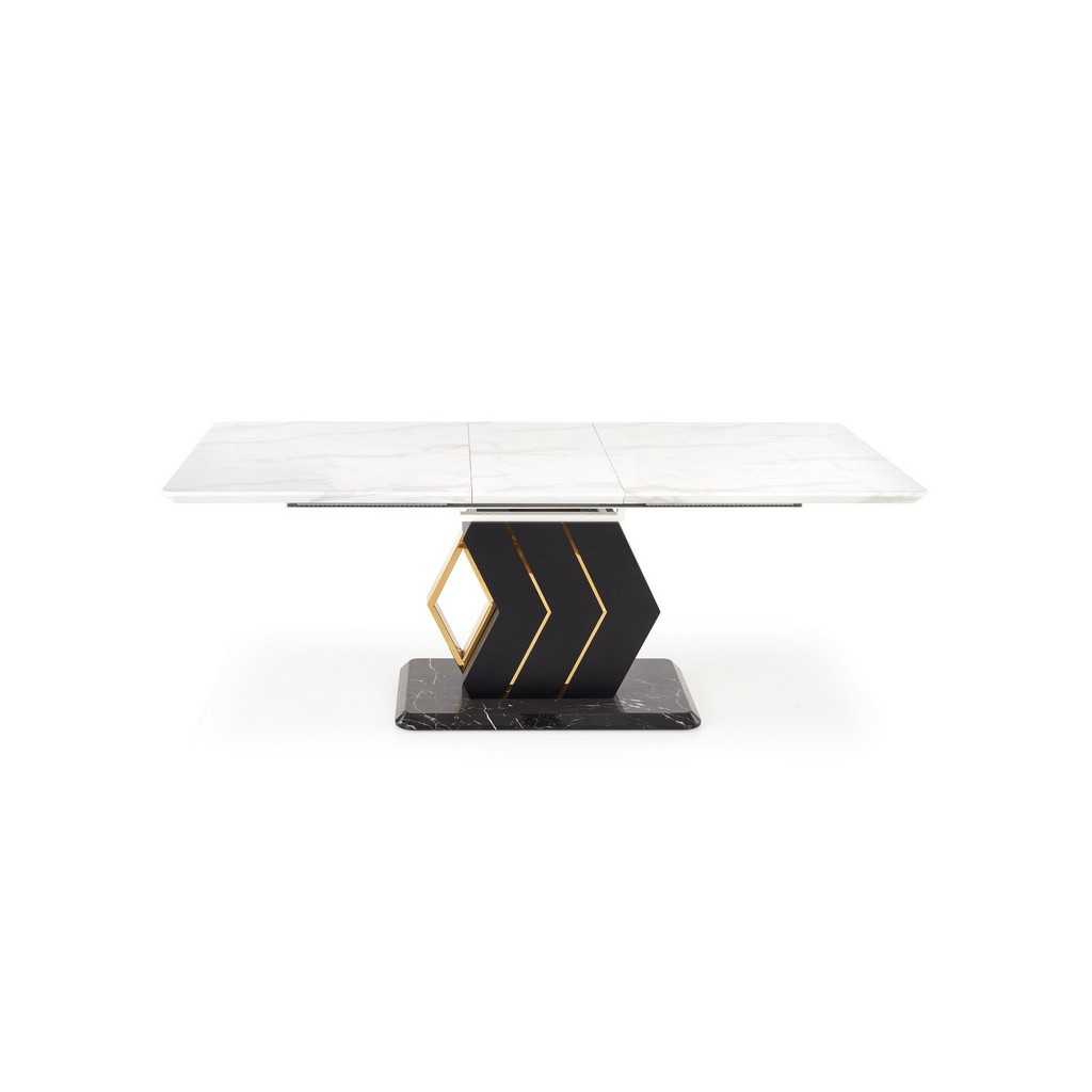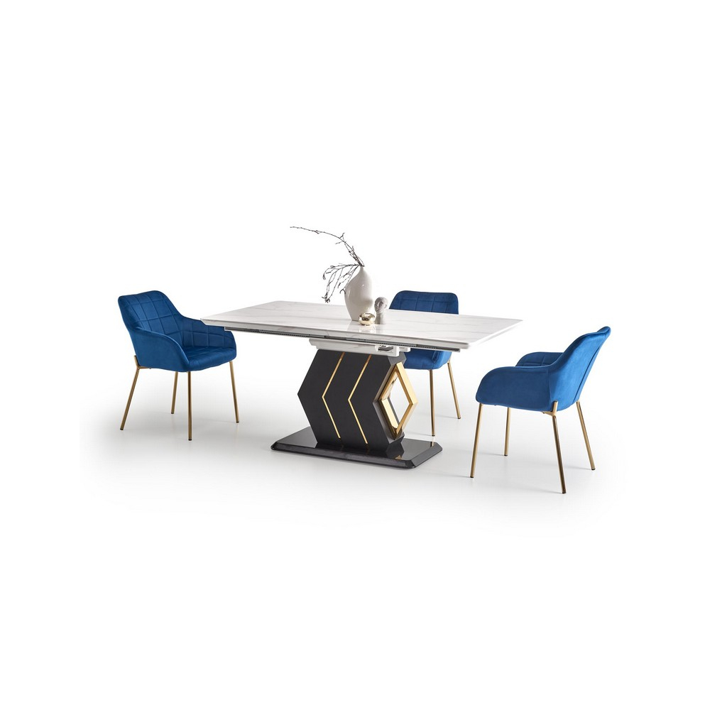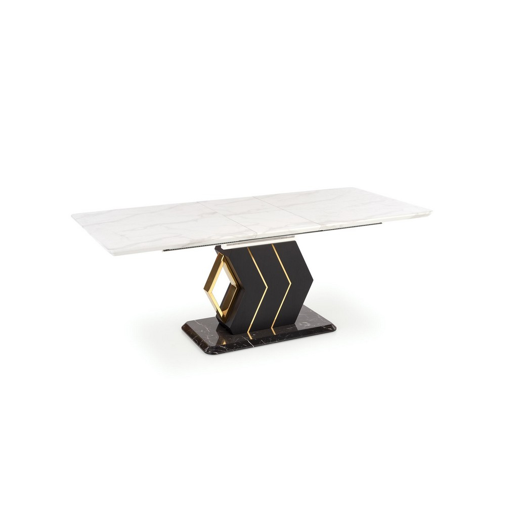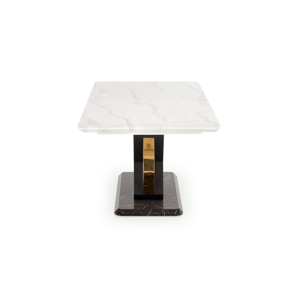 Noha z chromované oceli zajišťuje stabilitu stolu. Ta je umocněná obdélníkovou podstavou a efektem mramoru. Podnože nese desku z dýhovaných a lakovaných MDF desek s dekorem mramoru. Výhodou tohoto materiálu je snadná údržba – vystačíte si s vlhkým hadříkem.