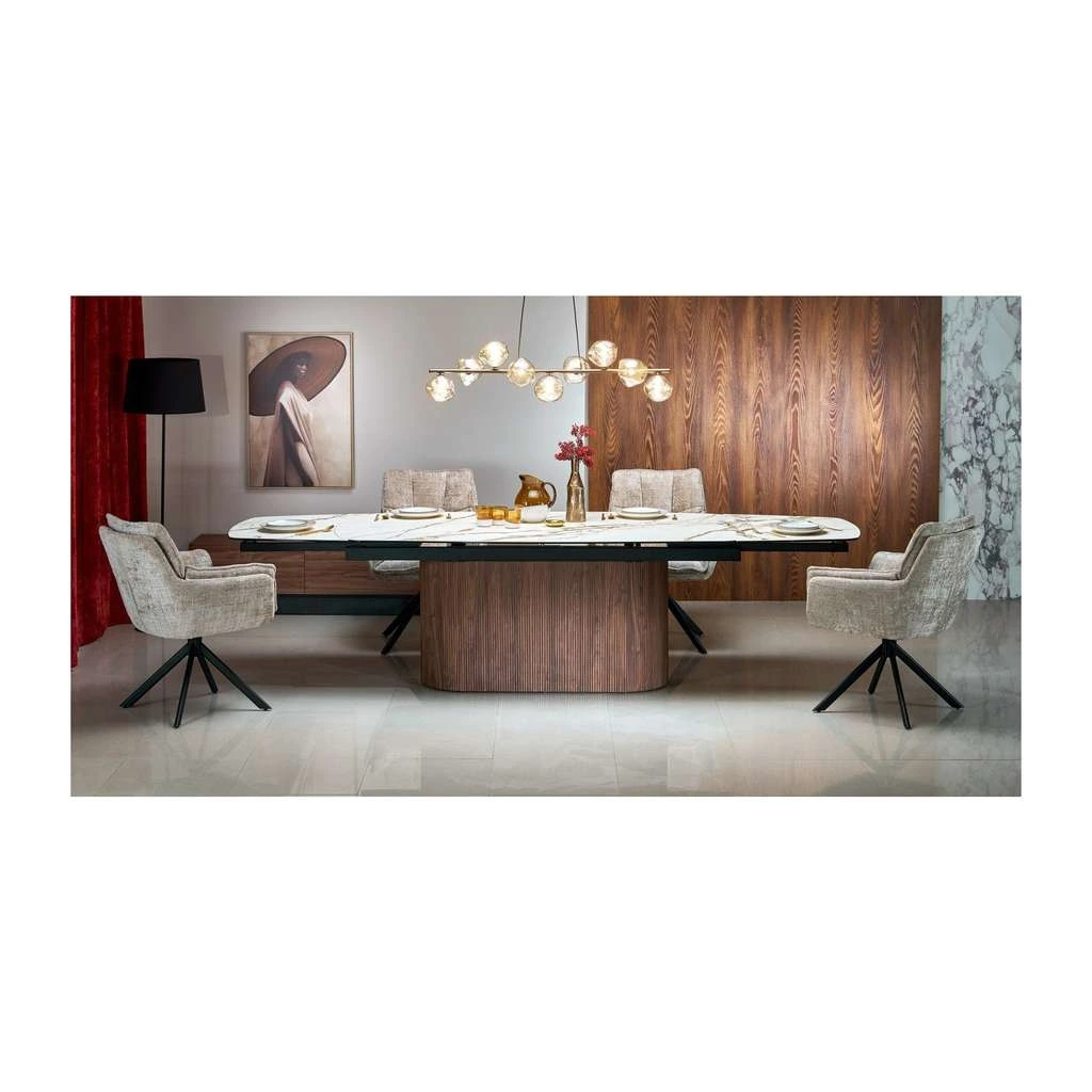 Jídelní stůl Zalongo vyniká nejen svým prostorným designem, ale také praktickou rozkládací funkcí, díky které snadno ubytuje až 10 osob. Jeho keramická horní deska je velmi odolná vůči poškrábání i teplu, což zajišťuje dlouhou životnost a snadnou údržbu. Stabilní dřevěná podnož zaručuje pevnost a odolnost stolu.