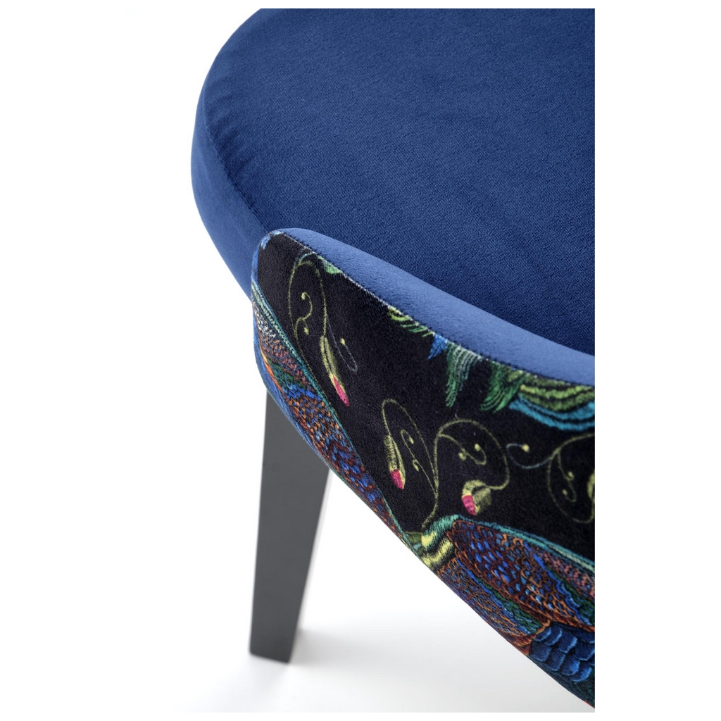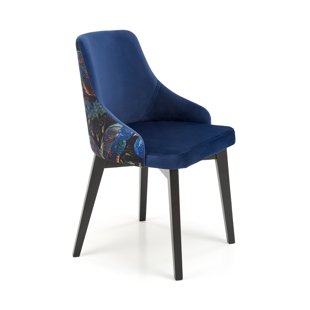 Židle Endo si zaslouží pozornost každého, kdo hledá do své jídelny osobitý nábytek. Na první pohled totiž zaujme svým vícebarevným potahem s motivem pávů na zadní straně.