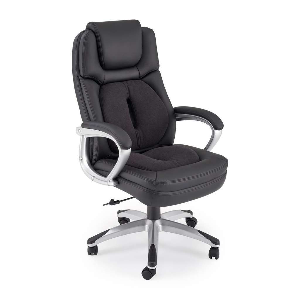 Křeslo je vybaveno pevnými područky, které zajišťují stabilní oporu paží při práci, a potahem z látky a ekologické kůže, což vytváří příjemný a prodyšný povrch vhodný pro každodenní využití. Robustní plastový kříž a kvalitní kolečka přizpůsobená do měkkých podlah zaručují stabilitu a snadný pohyb.