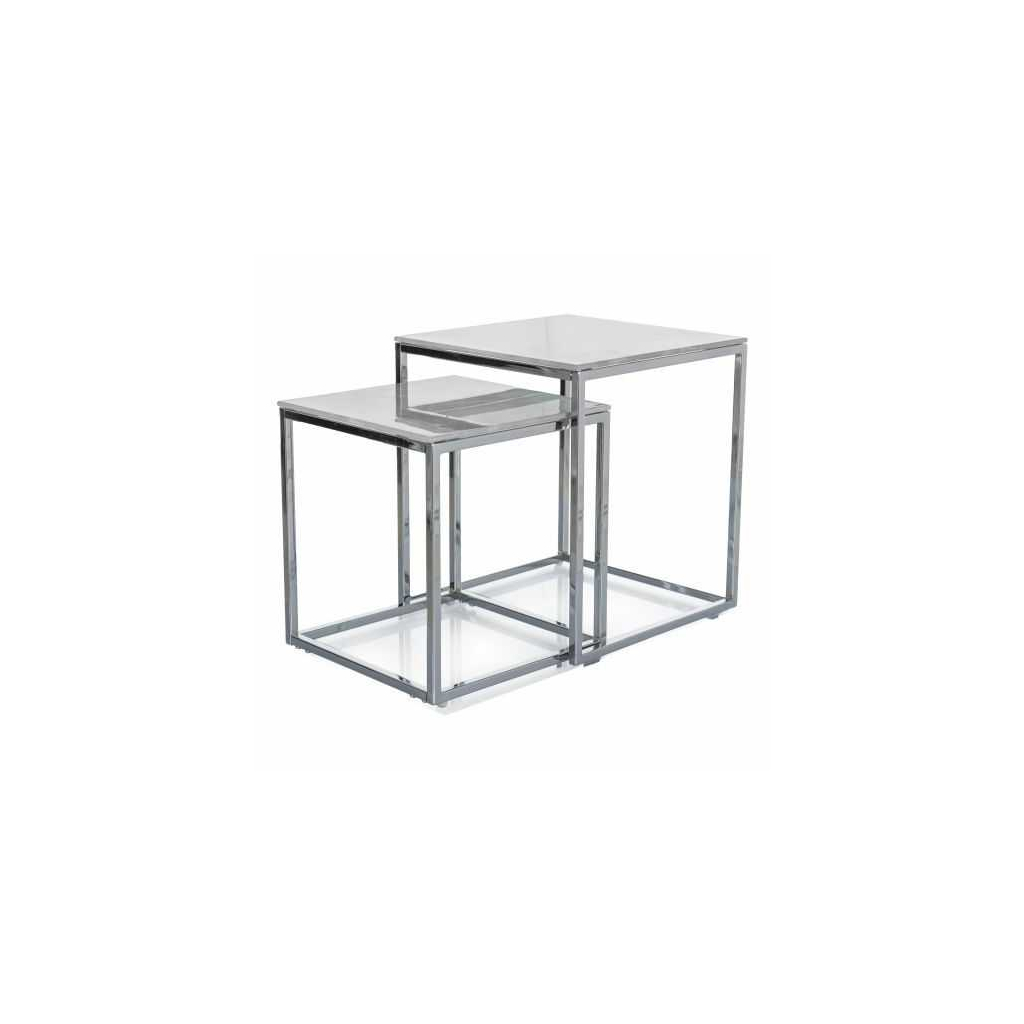 Desky čtvercového tvaru z tvrzeného skla s dekorem mramoru působí čistě a lehce, zatímco pevné, avšak svým provedením vzdušené kovové nohy zajistí stabilitu a odolnost. Jako celek působí stolky jako vkusné designové kousky.