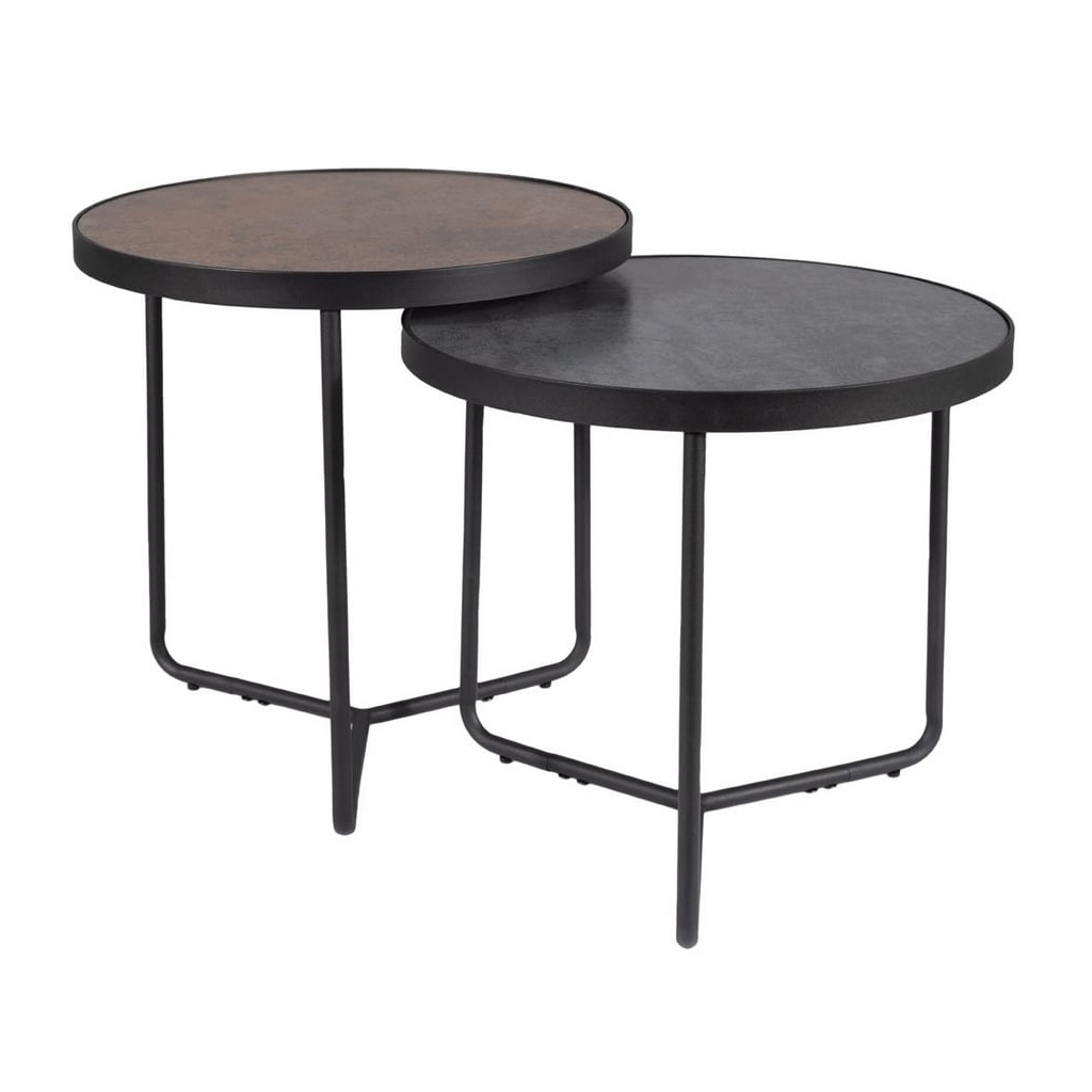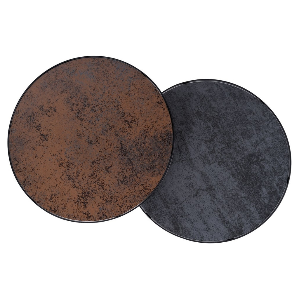 Oba stolky mají kruhovou desku z neprůhledného tvrzeného skla, kterou nesou černé kovové nohy.