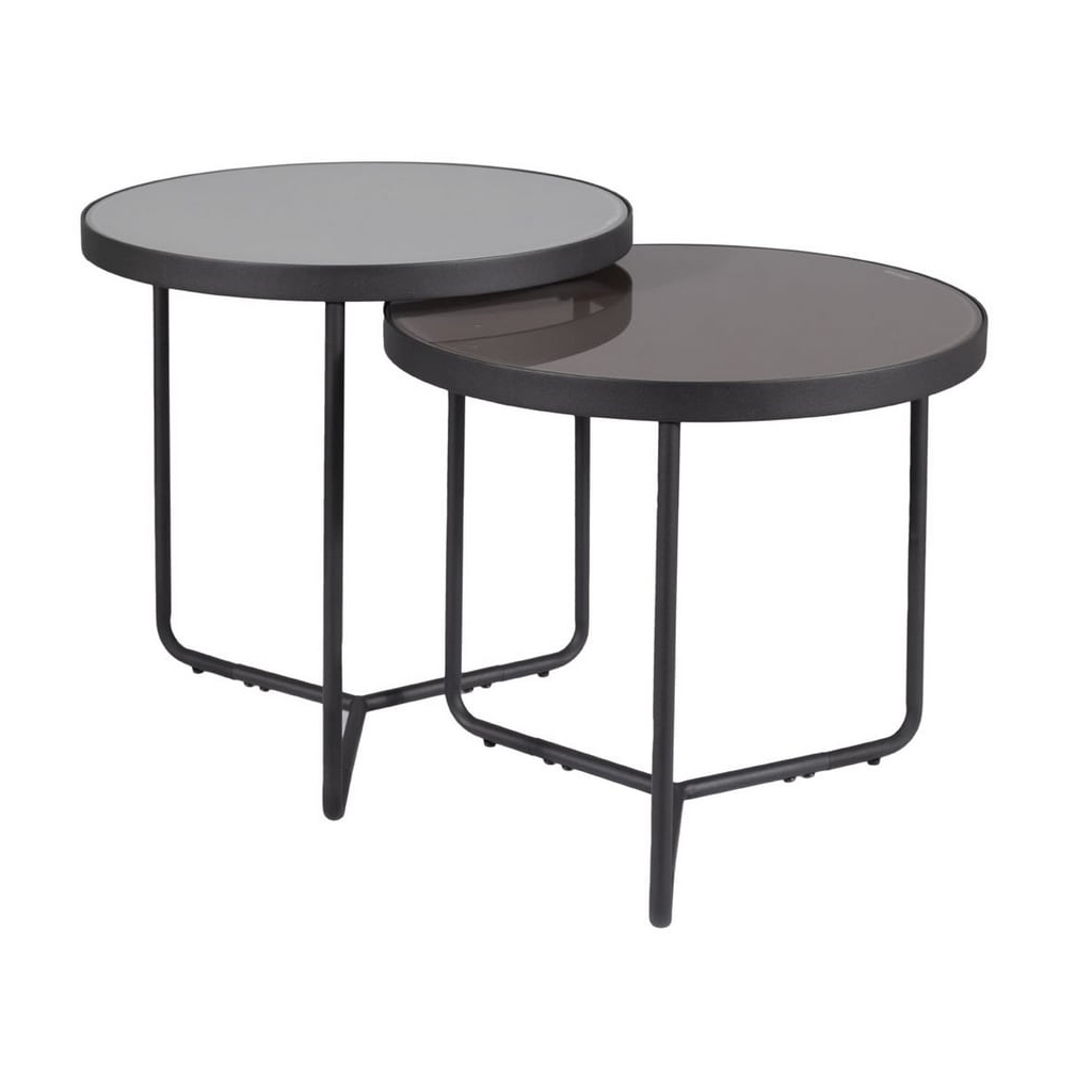 Oba stolky mají kruhovou desku z neprůhledného tvrzeného skla, kterou nesou černé kovové nohy.