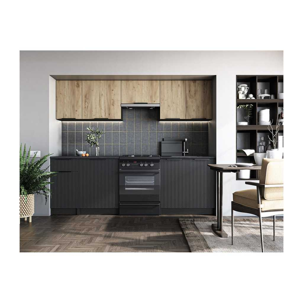 Spodní část sestavy (od soklů až po pracovní desku) je v elegantní černé barvě. S tou vkusně kontrastují dvířka horních skříněk s dekorem dubu artisan.