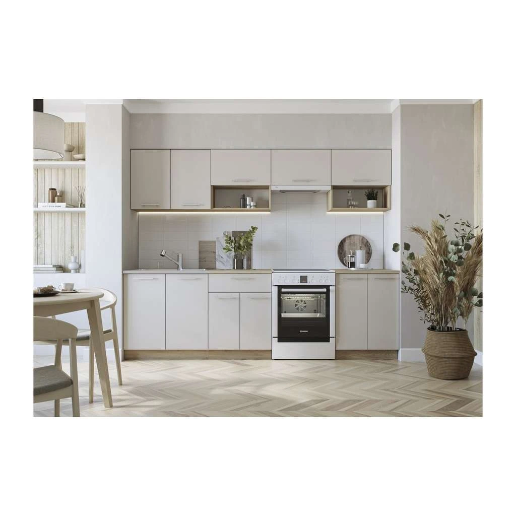 Kuchyňská linka Viola vytváří praktické pracovní prostředí, které je doplněno světlým designem. Je navržena v moderní kombinaci světlých barev a dezénu dubu sonoma. Kompletní sestava kuchyňské linky Viola je dlouhá 260 cm a ve svých skříních nabízí mnoho úložného místa pro nejrůznější kuchyňské pomocníky. Horní závěsné skříňky jsou vybaveny plynovými písty a jejich otevírání je tak velmi pohodlné. Linka disponuje pracovní deskou v elegantním bílém provedení.