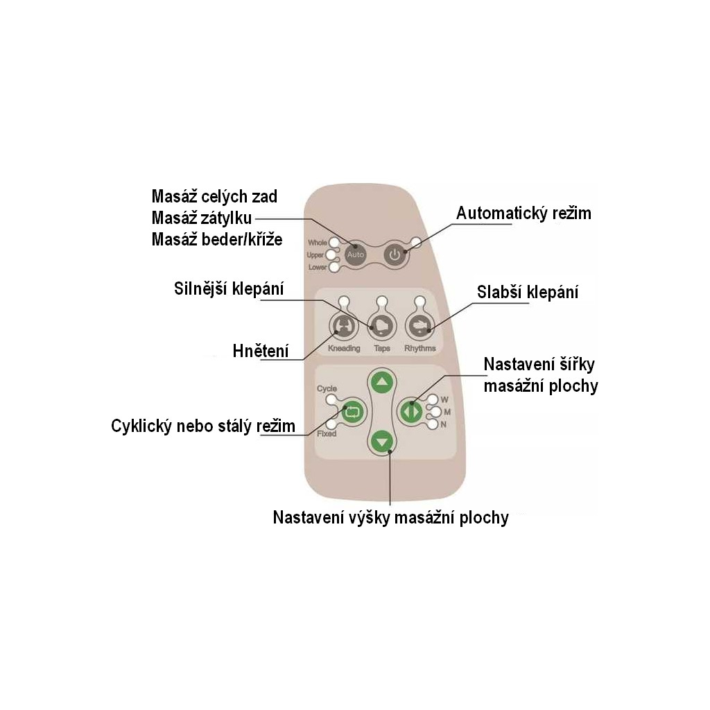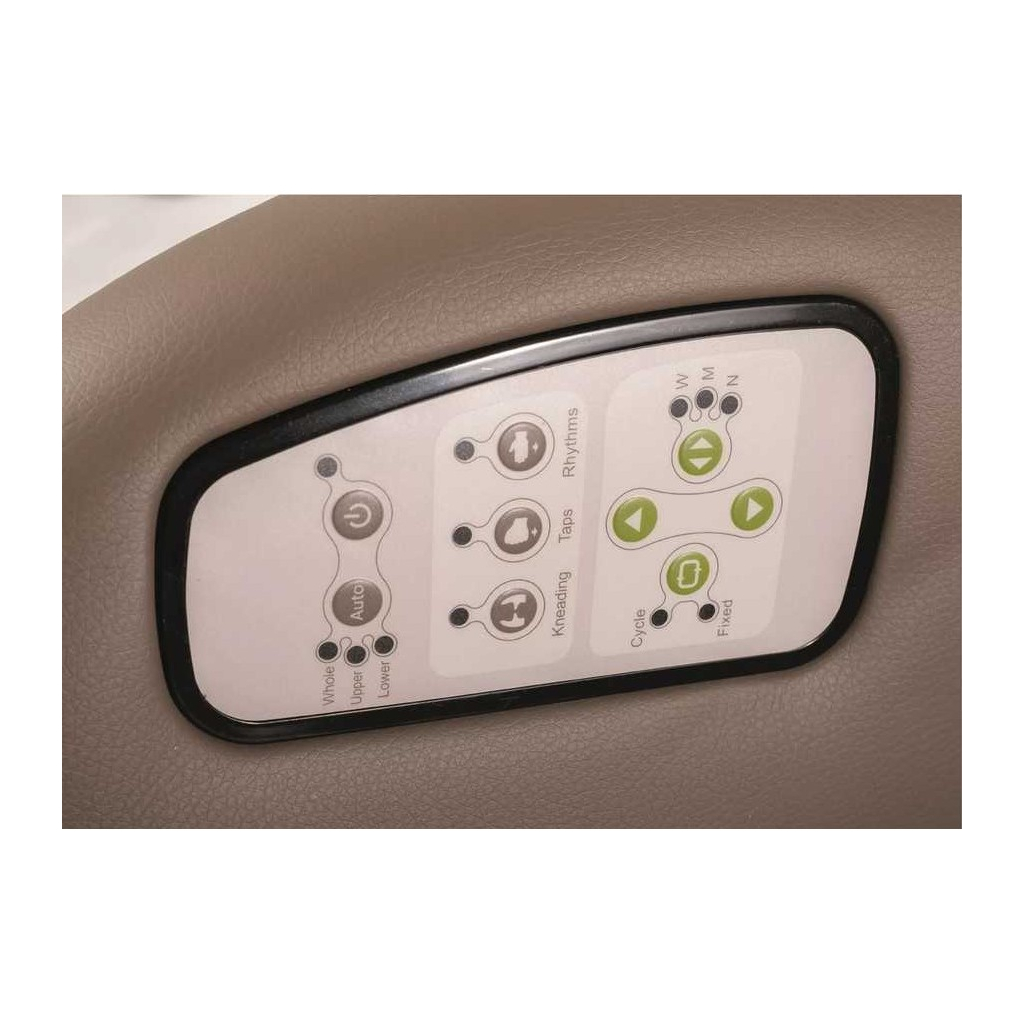 Křeslo je čalouněné koženkou, která nabízí prestižní vzhled a snadno se čistí. V zádové části se pod ní schovává masážní mechanismus, který obsluhuje ovládací panel na pravé područce. Tím si vyberete jeden z přednastavených programů, nebo si zážitek nastavíte přesně na míru.