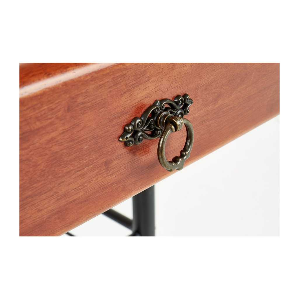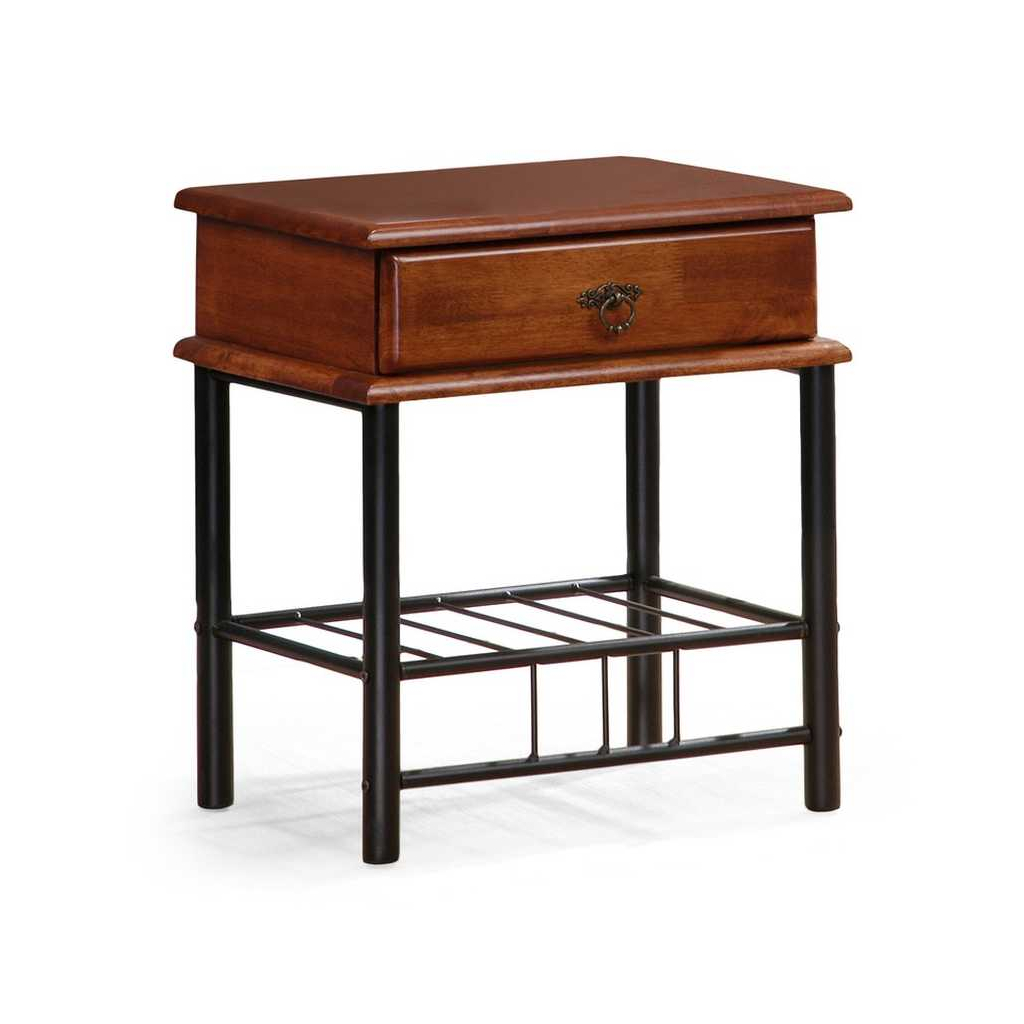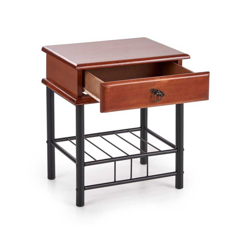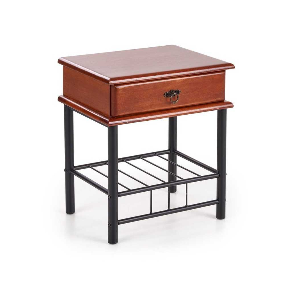 Noční stolek Fiona si vás získá svým sympaticky retro designem. Tělo z masivu v dezénu třešně působí až takřka rustikálně, což je dále podtrženo ozdobnou úchytkou s mosaznou patinou. Poněkud moderněji pak působí štíhlá kovová podnož podobná botníku – drátěná polička poslouží jako další odkládací prostor třeba na pantofle nebo knihy.
