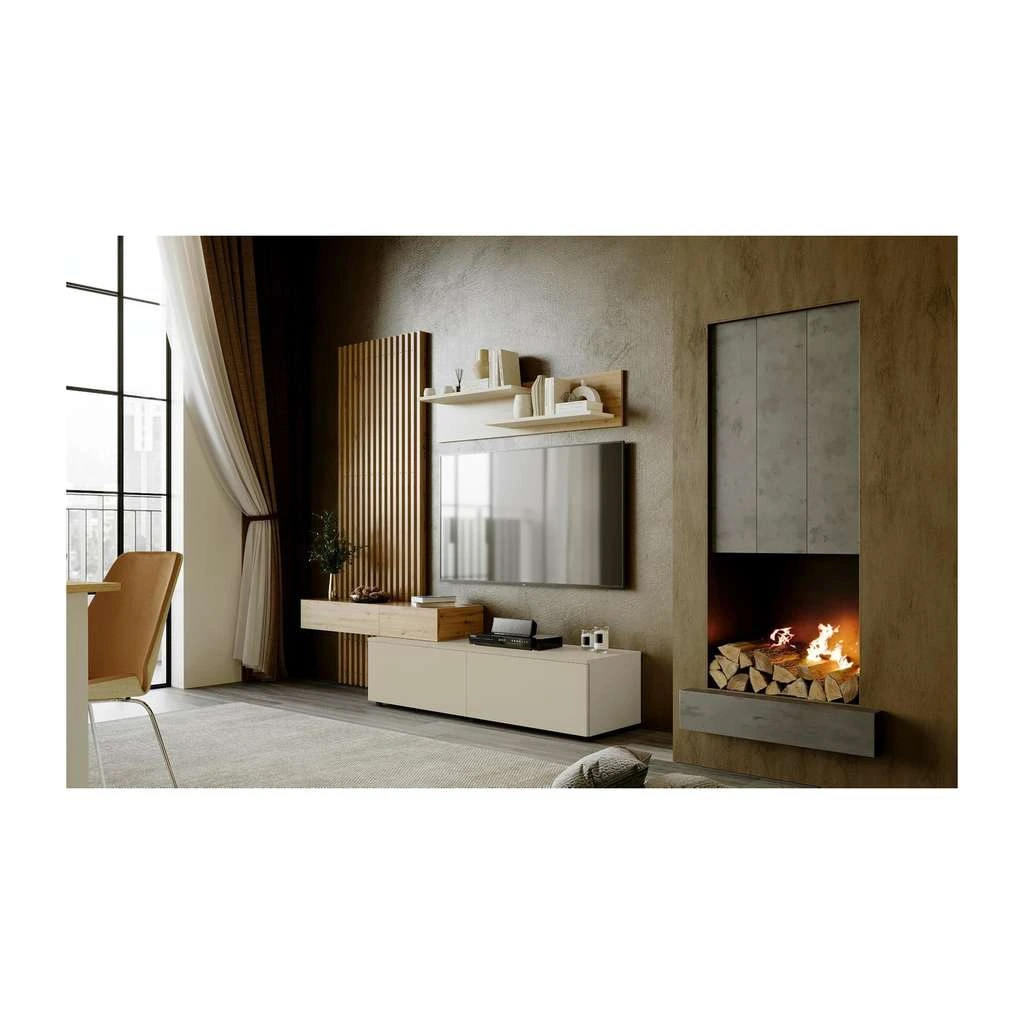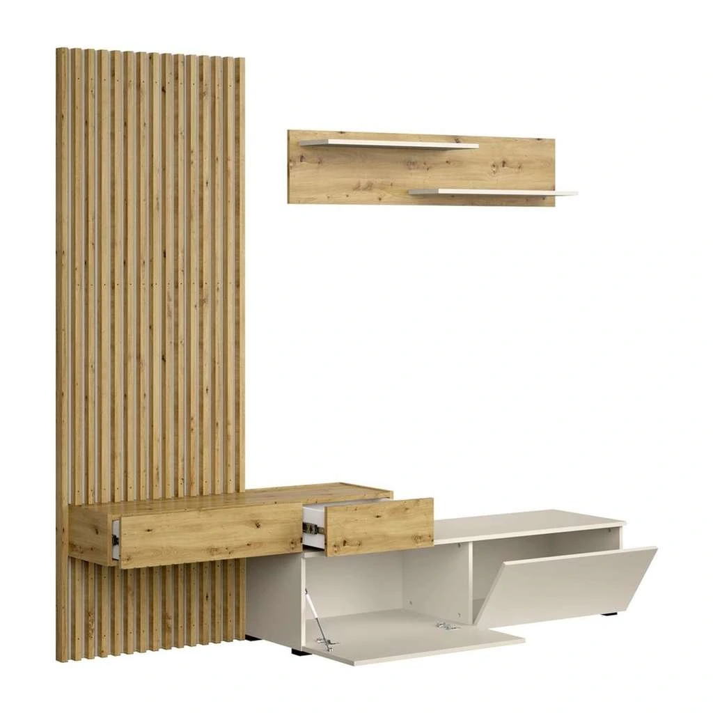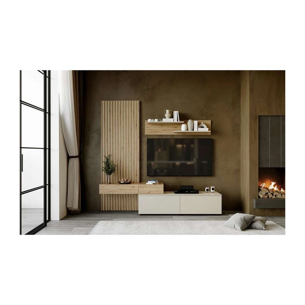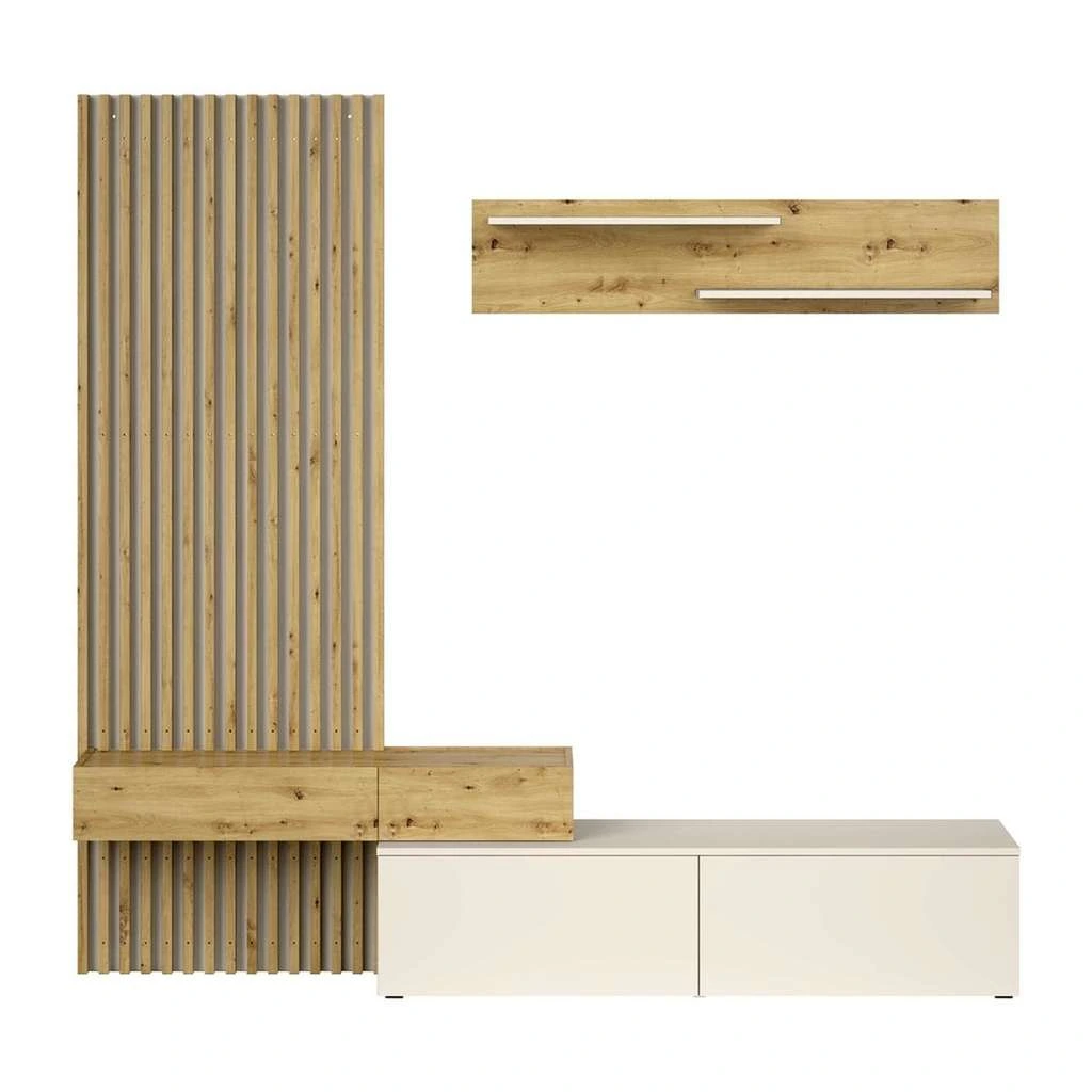 Design stěny vyzařuje jednoduchost a nadčasovost, která se snadno kombinuje s různými styly nábytku. Povrchové provedení v odstínech, které lze přizpůsobit dle vašich preferencí, zaručuje, že stěna bude skvěle vypadat v každém obývacím pokoji, aniž by dominovala prostoru.