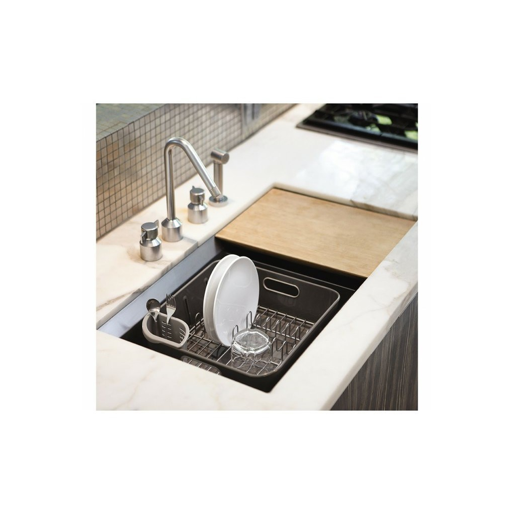 Je vyroben z odolného plastu v kombinaci s nerezovou ocelí. Má praktické nožičky, takže nestojí přímo na kuchyňské lince a neznečišťuje ji. Díky praktickým rozměrům se vejde i do dřezu. Součástí odkapávače je držák na příbory.