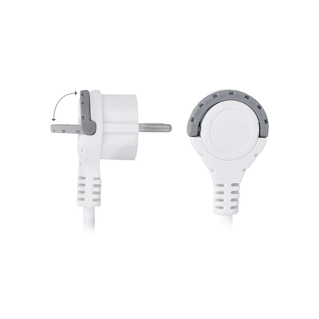 Délka kabelu 1,5 metru je ideální pro flexibilní umístění zařízení, a bezpečnost zajistí dětské pojistky a kvalitní provedení s krytím IP20. Praktická úhlová vidlice s nízkým profilem usnadňuje zasunutí do zásuvky i její vytažení.