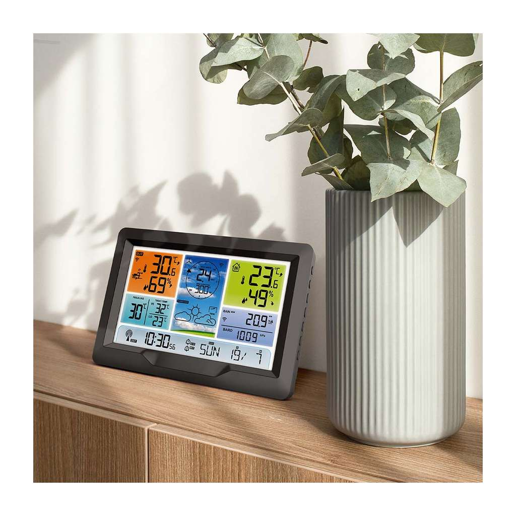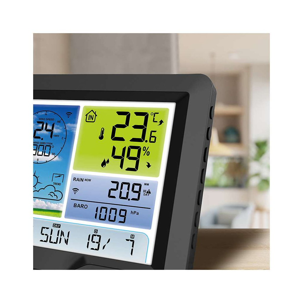 Displej s úhlopříčkou 19 cm je snadno čitelný a umožňuje nastavení podsvícení ve třech úrovních, což zvyšuje komfort při jakémkoliv osvětlení. Součástí je také praktická regulovatelná venkovní konzole s dosahem až 100 m a možnost připojit až tři další senzory, což umožňuje monitorovat podmínky na více místech současně.