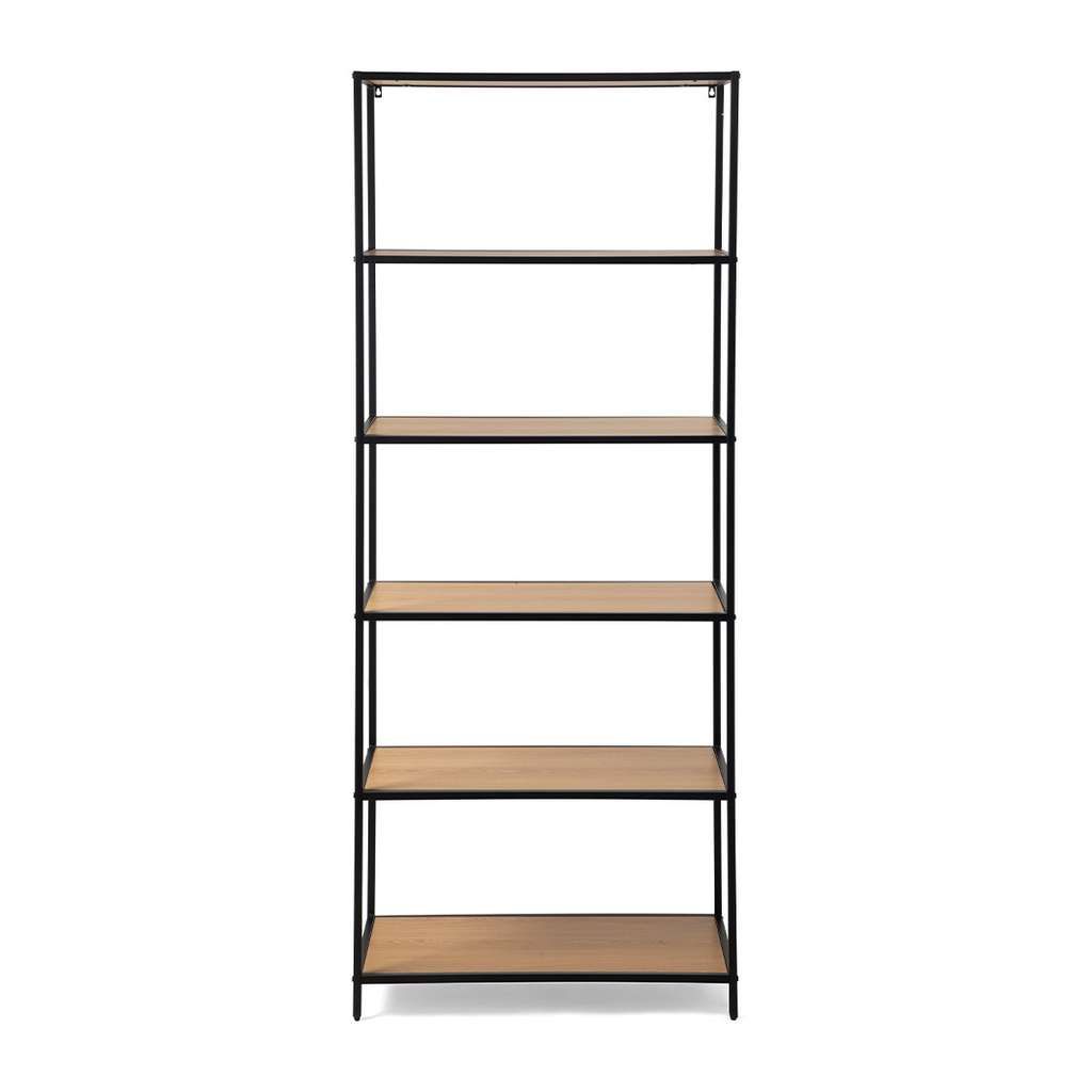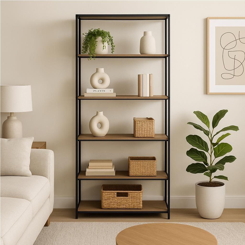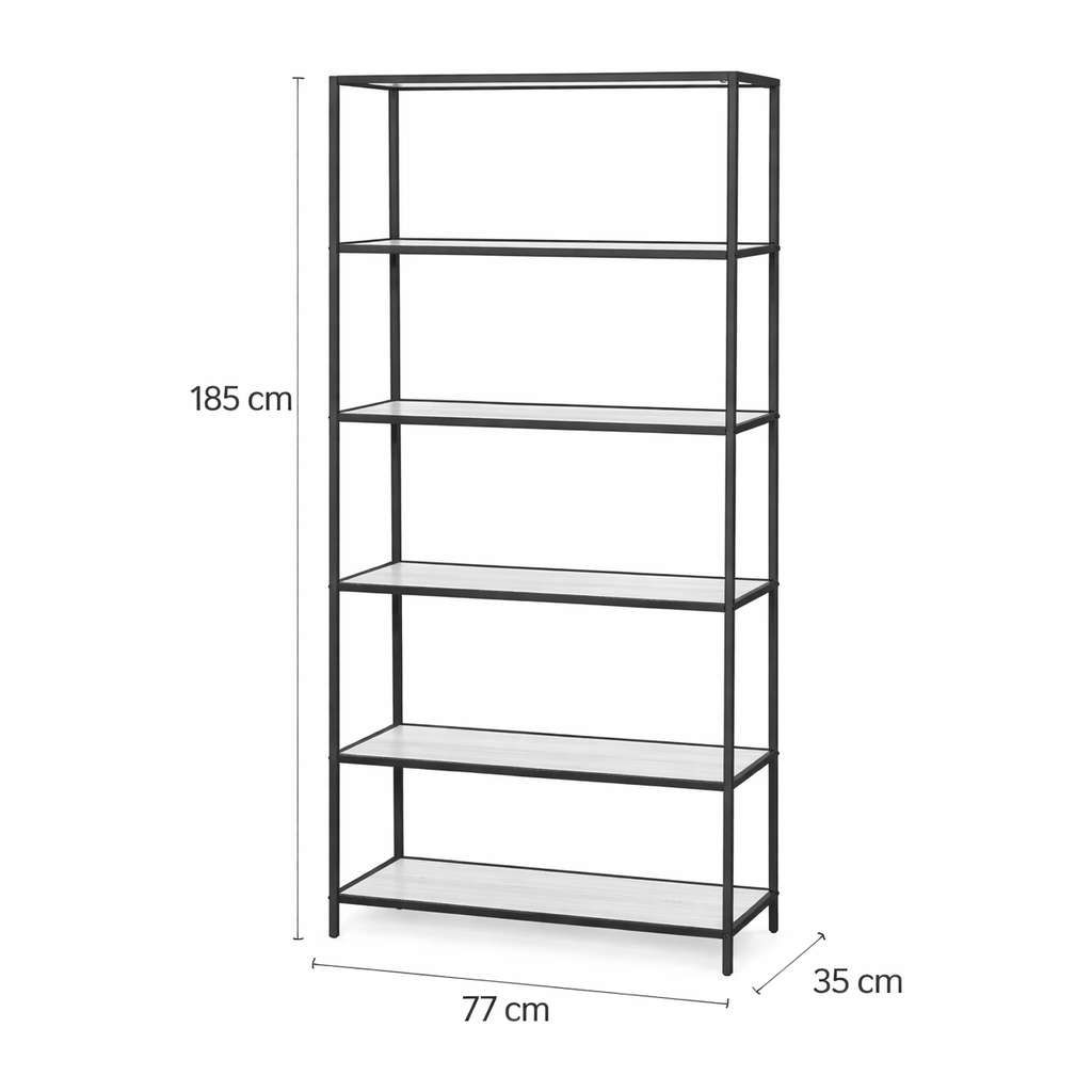 Otevřená konstrukce usnadňuje přístup k uloženým věcem a zároveň pomáhá udržet interiér vzdušný a přehledný. Regál lze využít jak jako praktickou knihovnu, tak i jako stylový úložný systém v obývacím pokoji, pracovně nebo obchodním prostoru.
