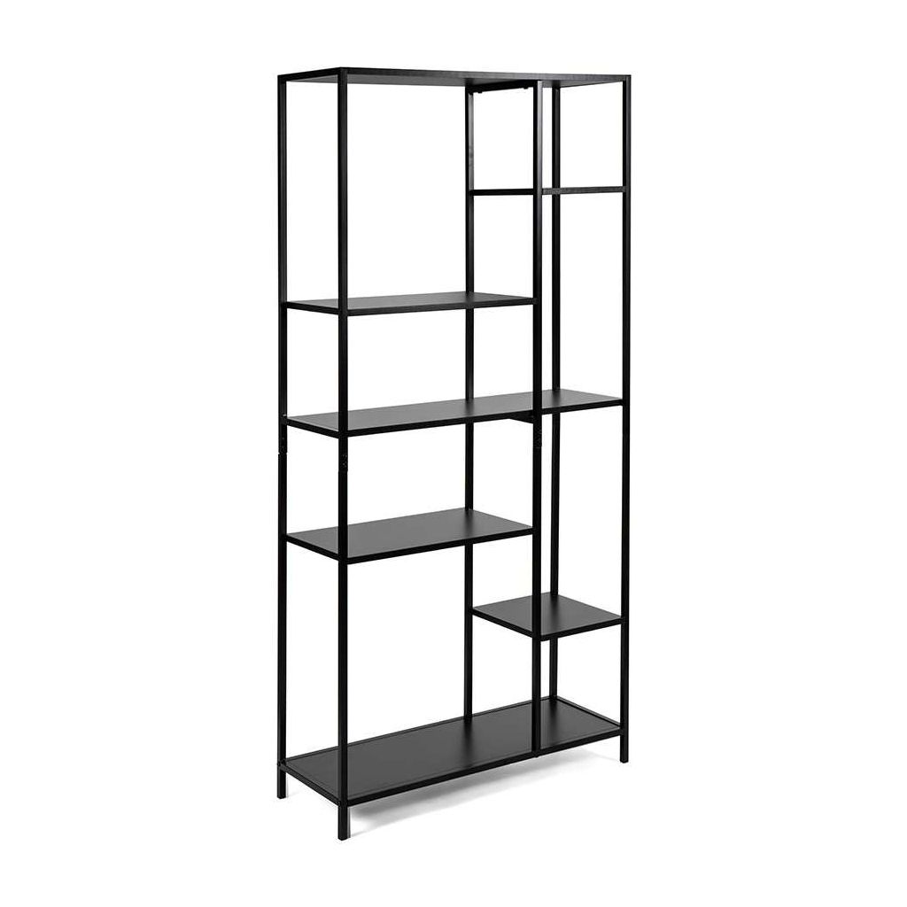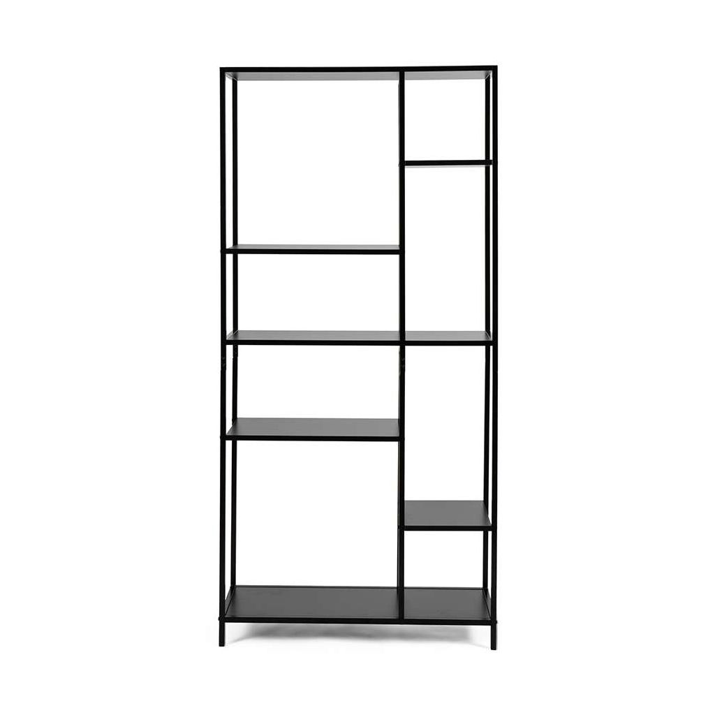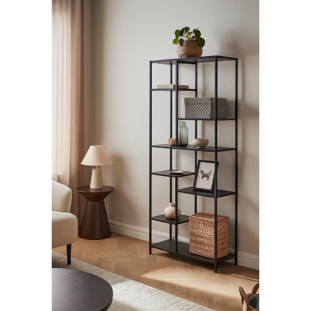 Asymetrické rozložení polic dodává regálu moderní vzhled a zároveň umožňuje efektivní využití prostoru. Otevřená konstrukce navíc nebrání průchodu světla, což pomáhá opticky nezatížit místnost a zachovat její svěží atmosféru.