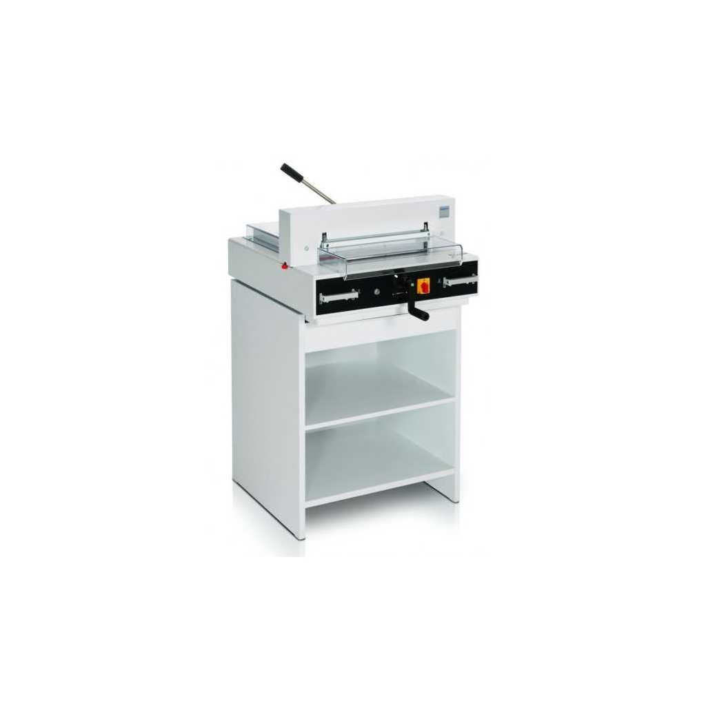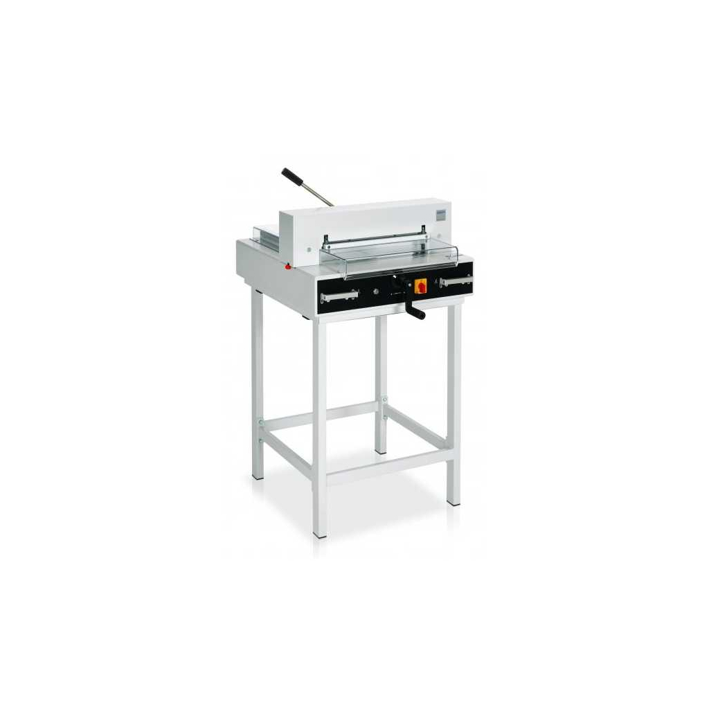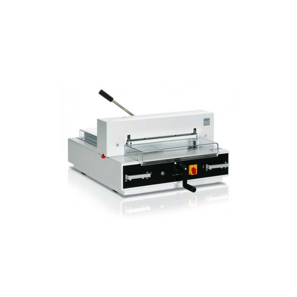 Řezačka EBA 4315 je profesionální stohová řezačka s elektrickým pohonem nože, ideální pro přesné a pohodlné řezání papíru ve formátech A3 a A3+. Díky délce řezu 43 cm zvládne efektivně zpracovat i větší množství materiálu s maximální výškou stohu až 40 mm a hloubkou vložení až 435 mm. Bezpečnost je zajištěna sklopným plexi krytem pracovního prostoru a nutností oboustranného spuštění řezu.