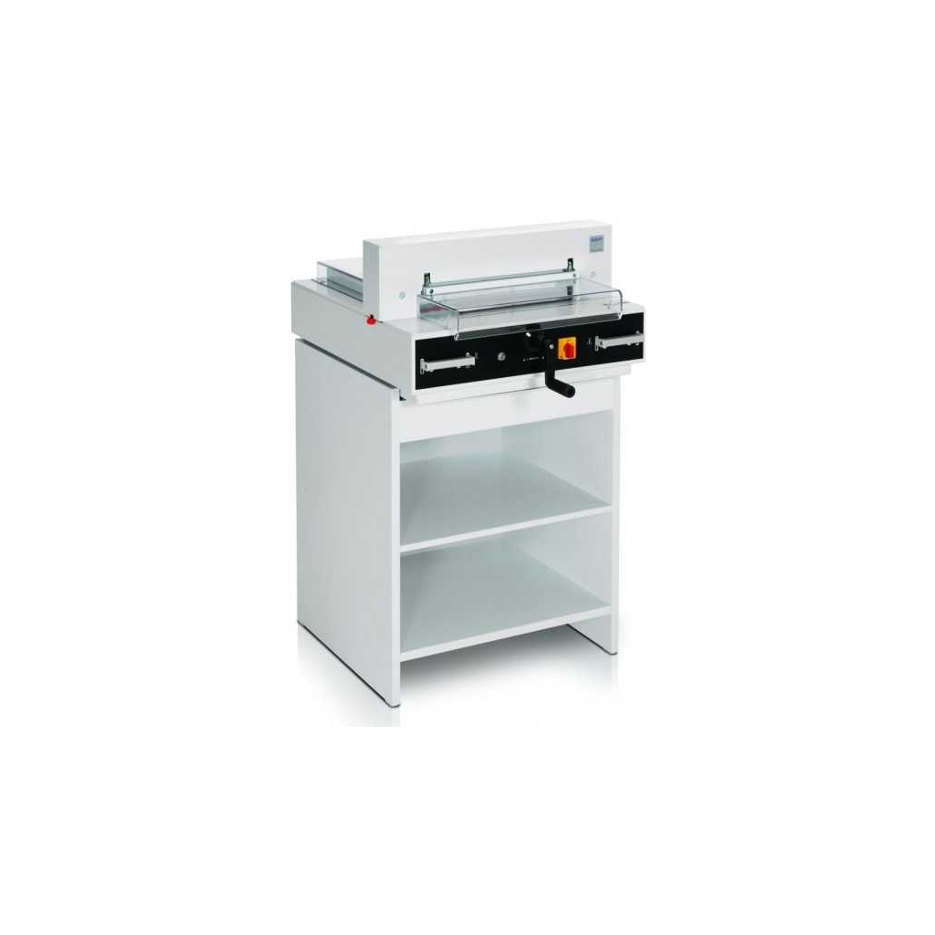 Řezačka EBA 4350 je profesionální stohová řezačka navržená pro přesné a pohodlné řezání papíru až do formátu A3 a A3+. Díky elektromechanickému pohonu nože a automatickému přítlaku zvládá efektivně řezat silnější stohy papíru s maximální výškou až 40 mm a hloubkou vložení 435 mm. Řezačka má délku řezu 43 cm, což umožňuje práci s většími formáty a usnadňuje řezání větších dokumentů či tiskovin.