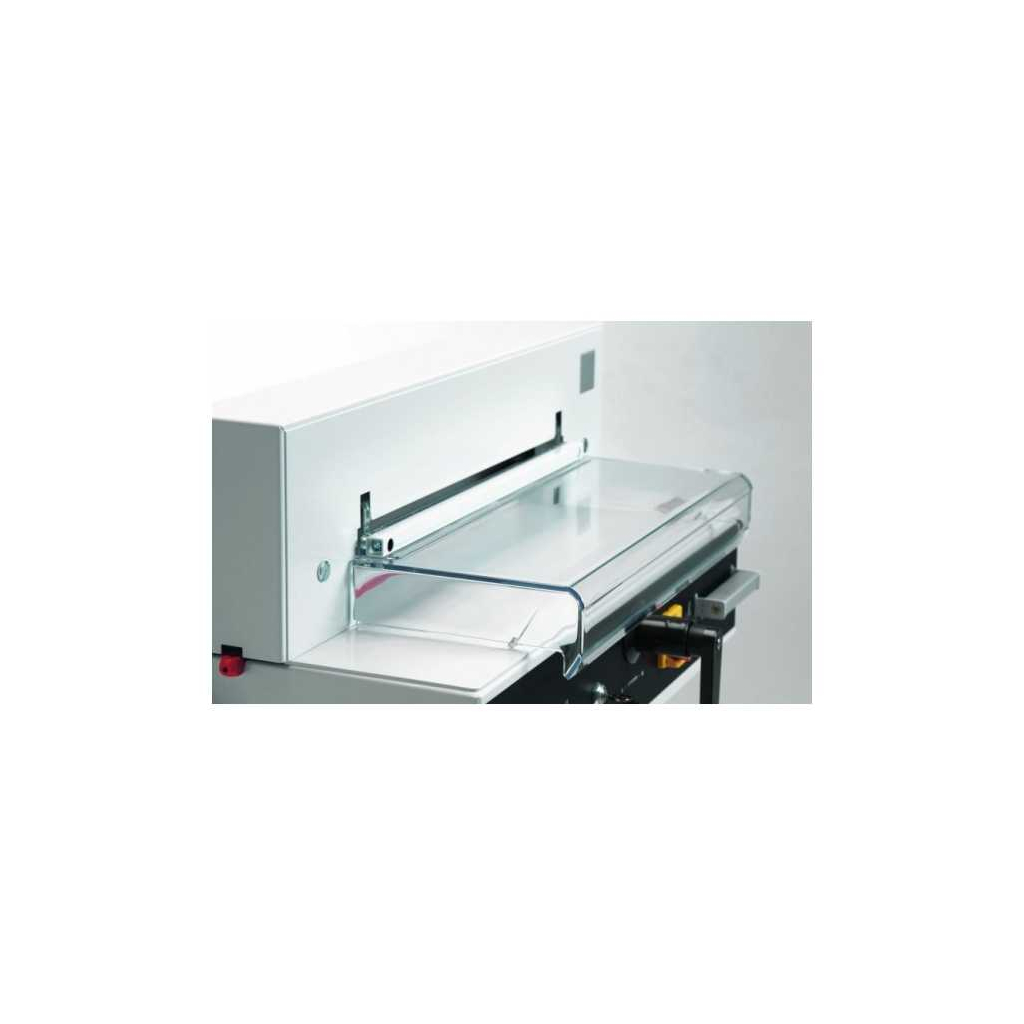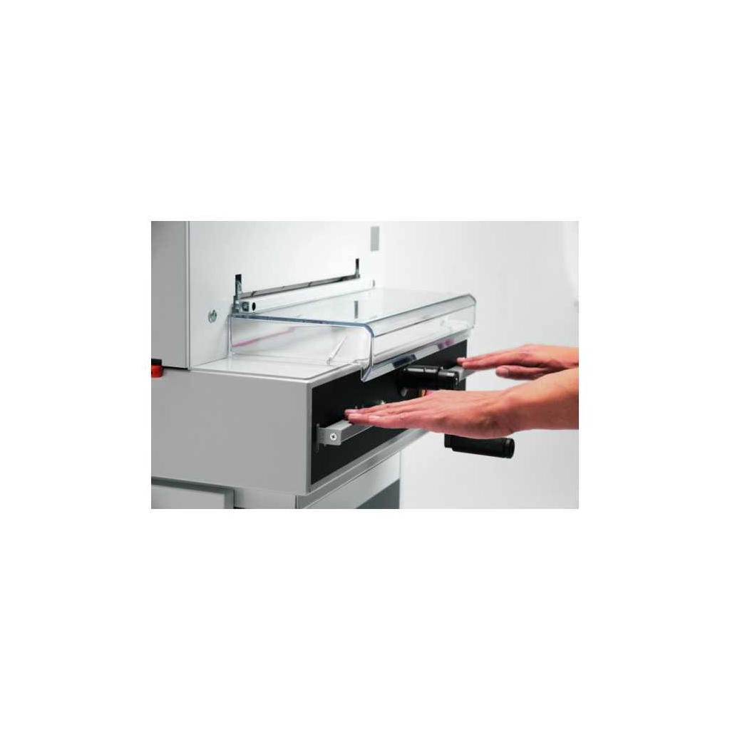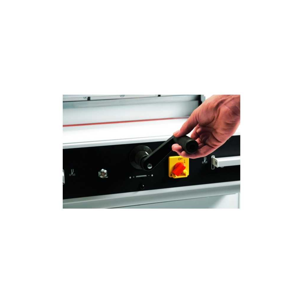 Bezpečnost je zajištěna transparentním sklopným plexi krytem, který chrání pracovní prostor a spuštění řezu je možné pouze oběma rukama, což minimalizuje riziko úrazu. Zadní doraz stohu je vybaven ručním vřetenovým posuvem s digitálním zobrazením vzdálenosti, což zajišťuje přesné nastavení a opakovatelný řez.