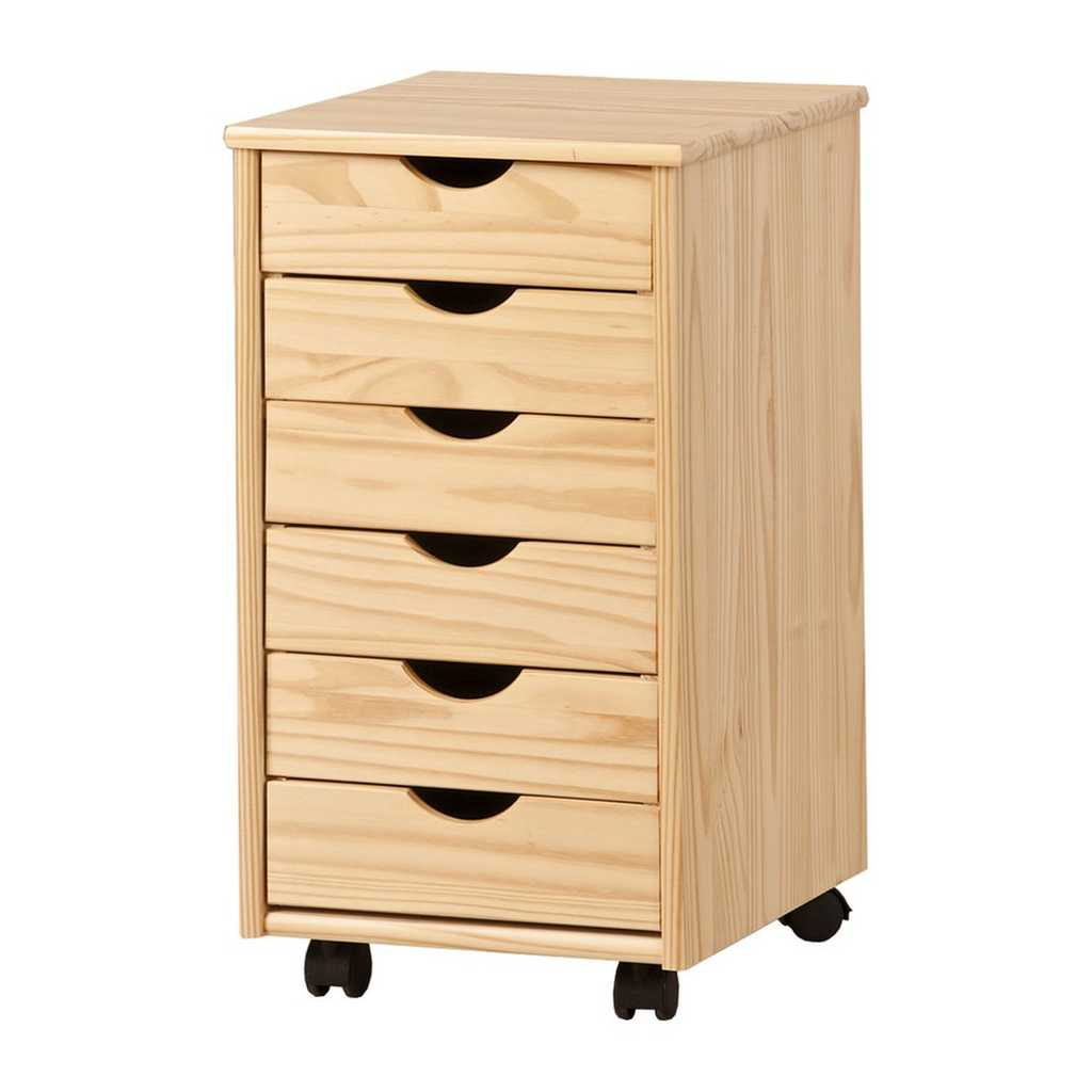 Kontejner je vyrobený z borovicového masivu s průhledným lakem. Kromě 6 zásuvek oceníte také kolečka, díky kterým jej snadno přemístíte třeba při uklízení.